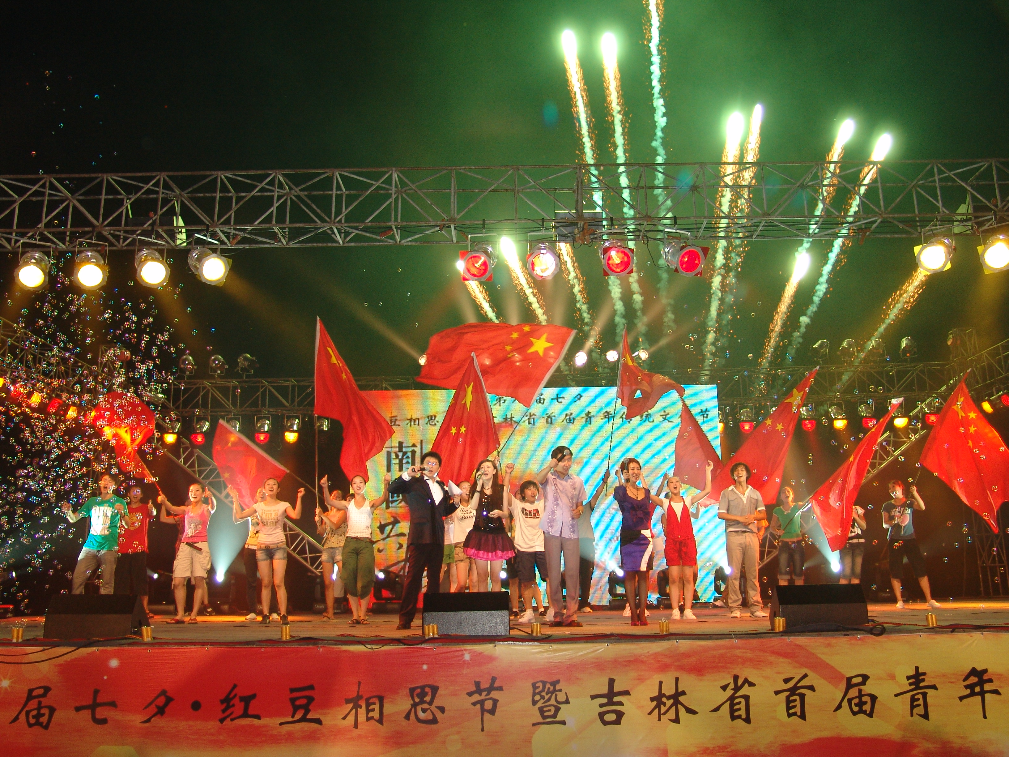 傳統(tǒng)七夕節(jié)(8月7日)這一天晚上,長春市文化廣場歌聲陣陣,音樂滿天,到處可見心形的氣球、鮮紅的玫瑰,一盞盞心愿燈緩緩升起,這里正在舉辦第八屆七夕·紅豆情人節(jié)暨吉林首屆青年傳統(tǒng)文化節(jié)。首推七夕·紅豆情人節(jié)的周耀庭在這次活動中高興地說“紅豆集團(tuán)原本計(jì)劃要用5個5年的時間推廣七夕節(jié),但現(xiàn)在看來這個時間要提前了?!?這次活動由共青團(tuán)吉林省委、吉林省青年聯(lián)合會、紅豆集團(tuán)、吉林電視臺、城市晚報社、長春交通之聲共同舉辦,共青團(tuán)吉林省委書記謝忠?guī)r,九屆、十屆全國人大代表、紅豆集團(tuán)董事局主席周耀庭等領(lǐng)導(dǎo)出席了這次活動。文化廣場上人山人海,有20000多名長春市民積極自愿參加這次活動,快樂的度過了美麗的七夕。